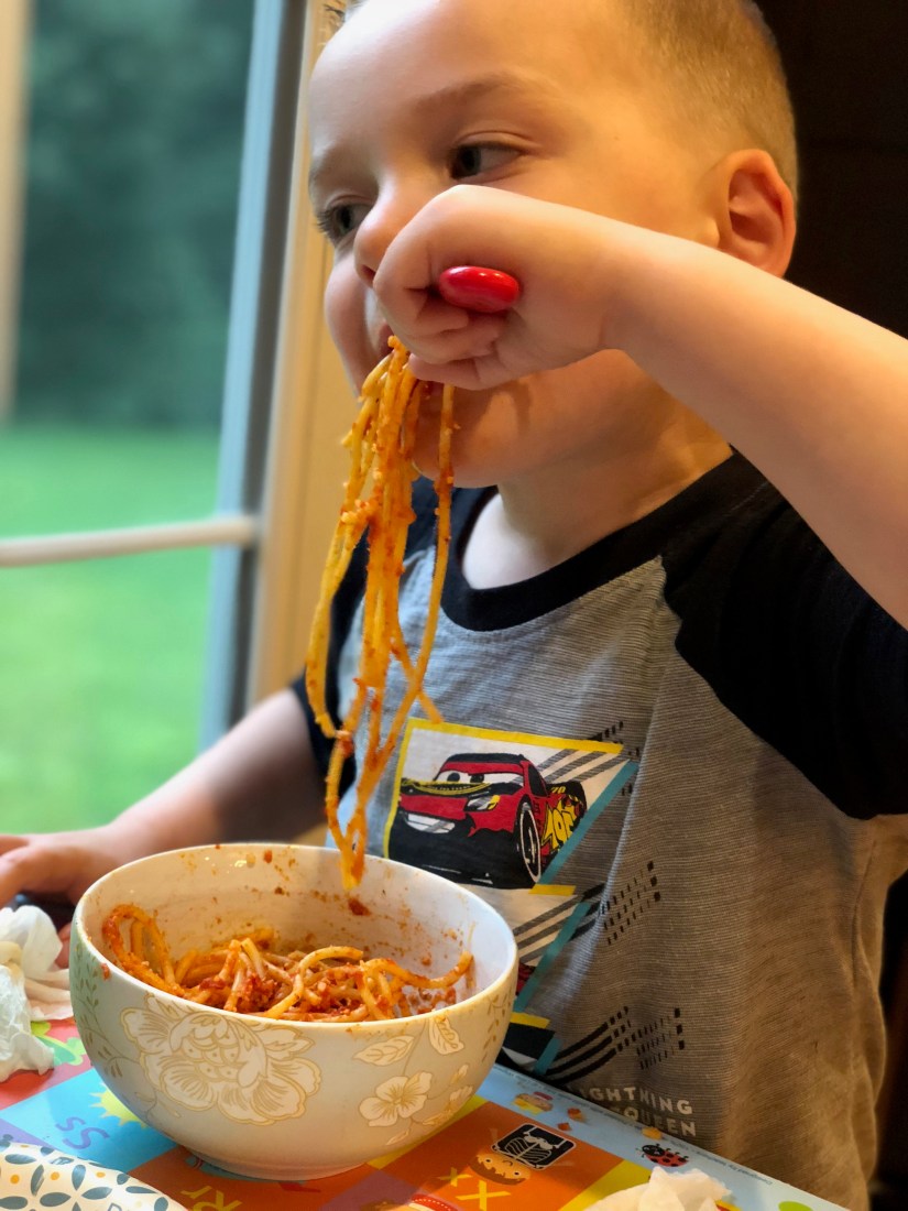 - Pasta with sauce (depends on the shape of the pasta, how soft the pasta is (he prefers al dente) and whether or not there is visible basil or oregano “green stuff” in the sauce