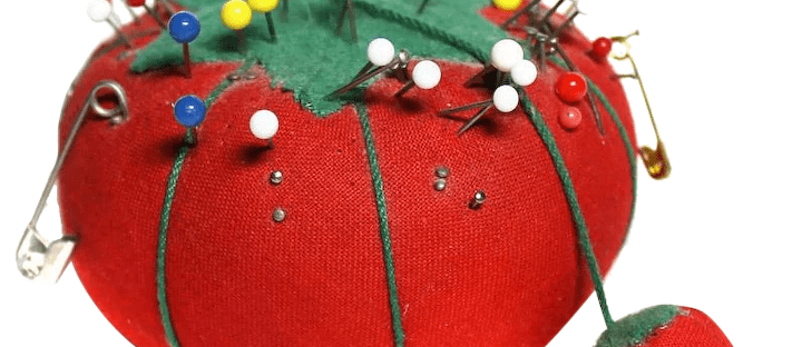 I remember when I was little my mother had this pin cushion shaped like a tomato filled with stick pins with little balls on the ends in rainbow of colors. Also in the cushion was always a needle or two, long tail of thread hanging off of them. There was also an accompanying plastic box of straight pins because you never could have too many pins, I guess. But the thing was, she used that pin cushion all the time, to attach a button, sew a rip or hem pants. Me? I tend to ship out my sewing to my mother or mother-in-law.