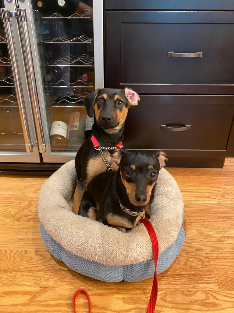 Rocco and Bruno are still trying to figure out their place with each other. When we first brought Bruno home, he and Rocco (who is full grown) were almost the same size, Bruno being 8 pounds to Rocco’s 10. But any size advantage Rocco had quickly diminished when Bruno started gaining a pound a week. He quickly was taller (and stronger) than Rocco, though he was still a clumsy puppy so Rocco was able to push him around. They spent quite a bit of time wrestling (and still do!), though their interactions have grown louder. And Bruno has become bolder. And Rocco spends a lot of time hiding under chairs.