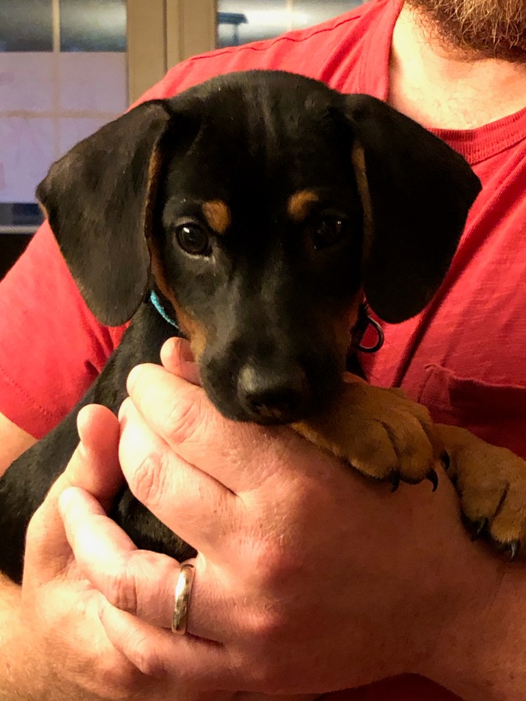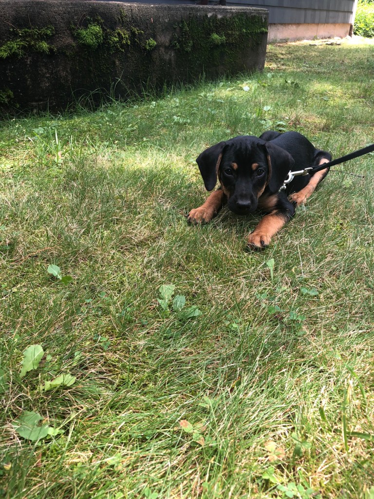 We are a rescue family. Rocco was rescued last March at 4 months old, and we wanted to do the same for our second dog. Bruno was rescued in July at just 9 weeks old! They said he was a “doxie mix”, and he was available with his litter mates: two sisters, one who was black and brown like he was (but smaller) and one who was completely tan. That, in itself, was a little suspicious. When we arrived at the shelter he was alone, his sisters had already been adopted earlier in the day. He was sleeping peacefully outside, his little round, pink belly rising and falling with each breath. I picked him up and inhaled his puppy smell. Is there anything better than new puppy smell? Probably second only to new baby smell.
