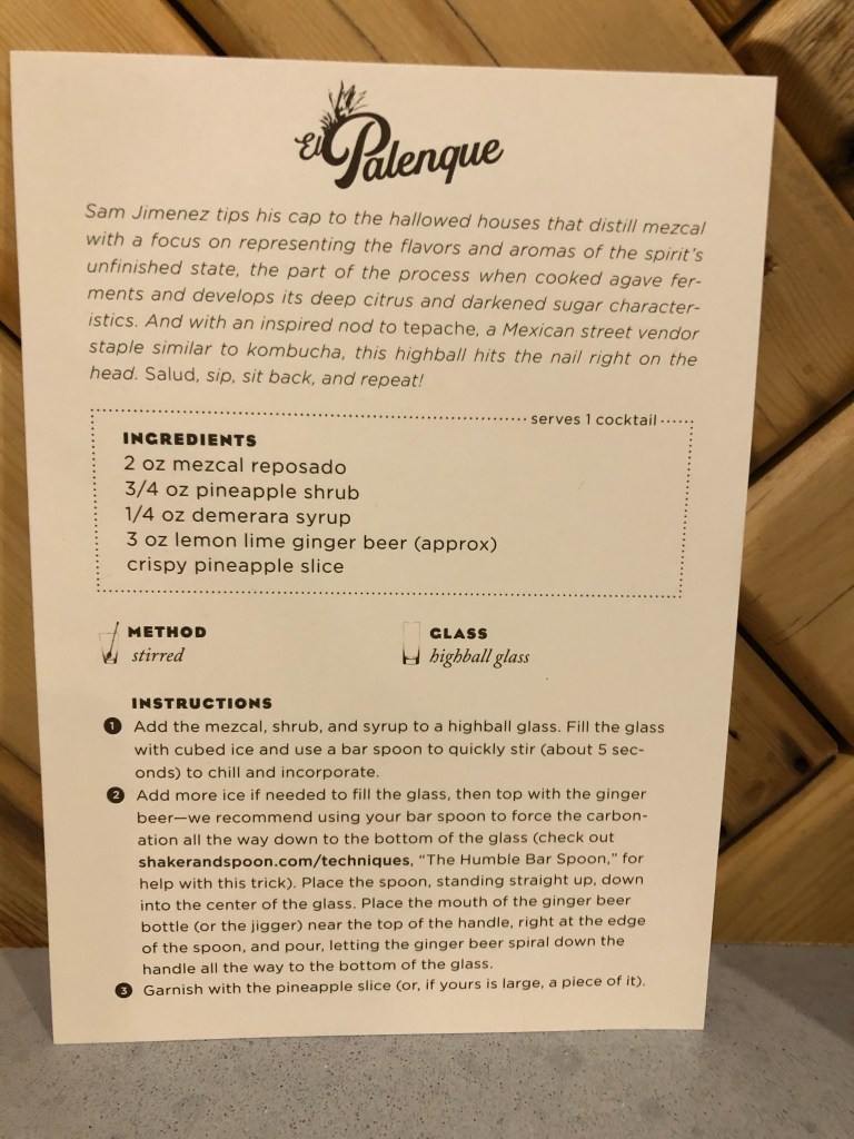Tonight we sampled the El Palenque, made with Mezcal, pineapple shrub, lime ginger beer.