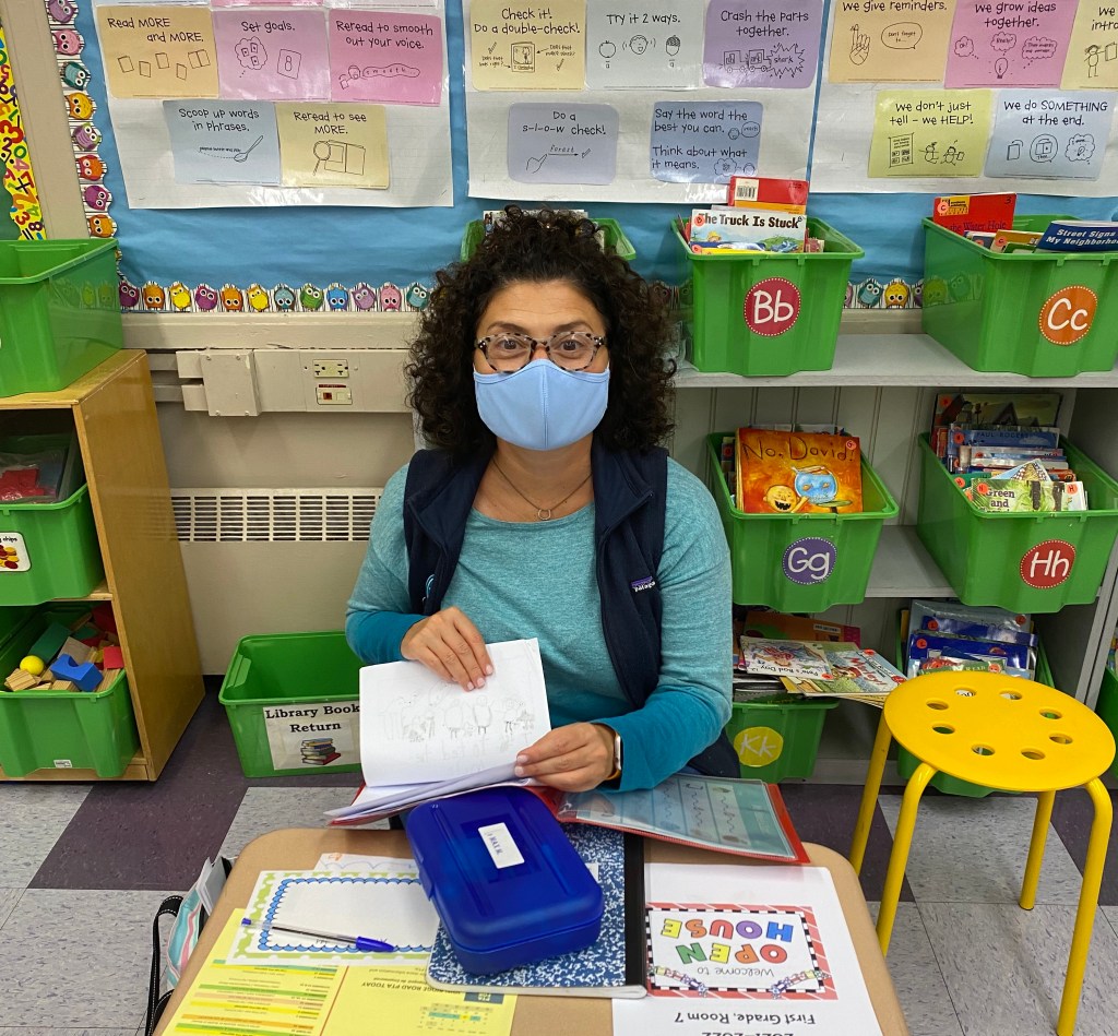Me, at Little Mister’s desk, during Open House.