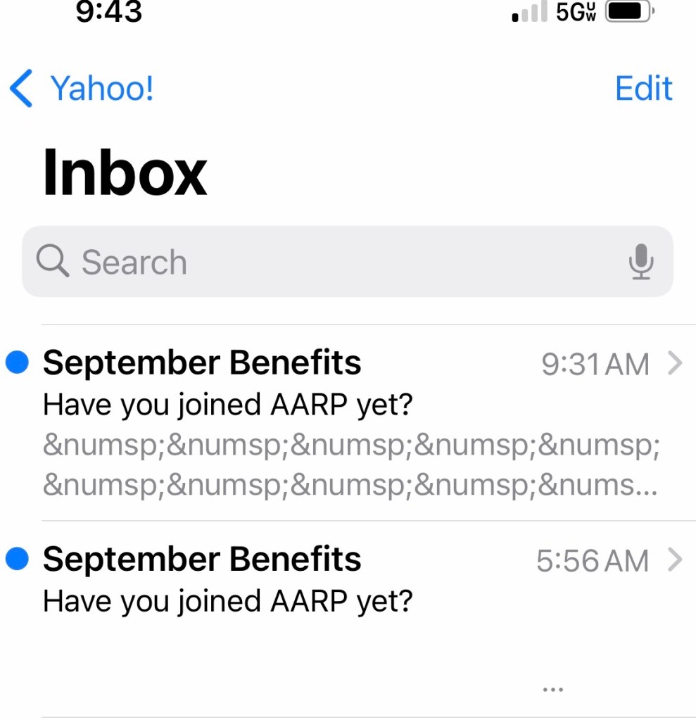 But AARP doesn’t seem to have gotten that message that I’m not quite a senior, however, because my inbox looks like this:
