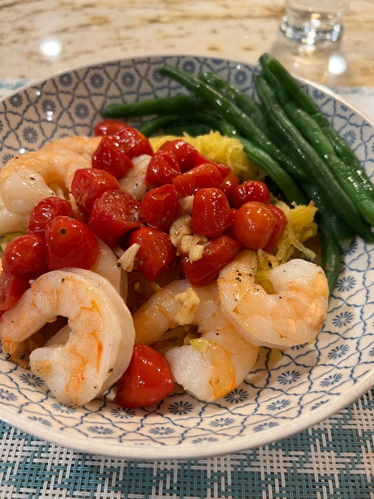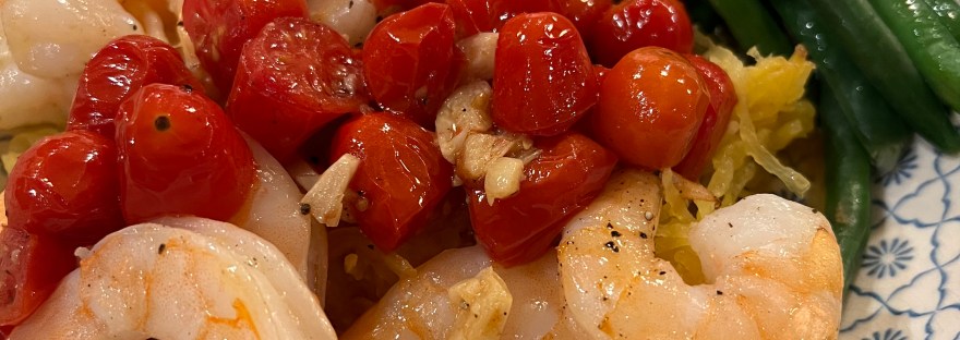 Actually, this dish is delicious – I made it last week and it was so good it’s having a repeat performance. It’s shrimp and tomatoes and garlic over spaghetti squash. If you’re not familiar with spaghetti squash, when you cook it you can can shred the flesh with a fork and it turns into these long strands that resemble – you guessed it – spaghetti.