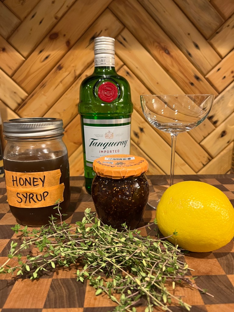 In a cocktail shaker, add the gin, honey syrup, lemon juice, fig preserves and 2 sprigs of thyme. Add ice and shake vigorously.
