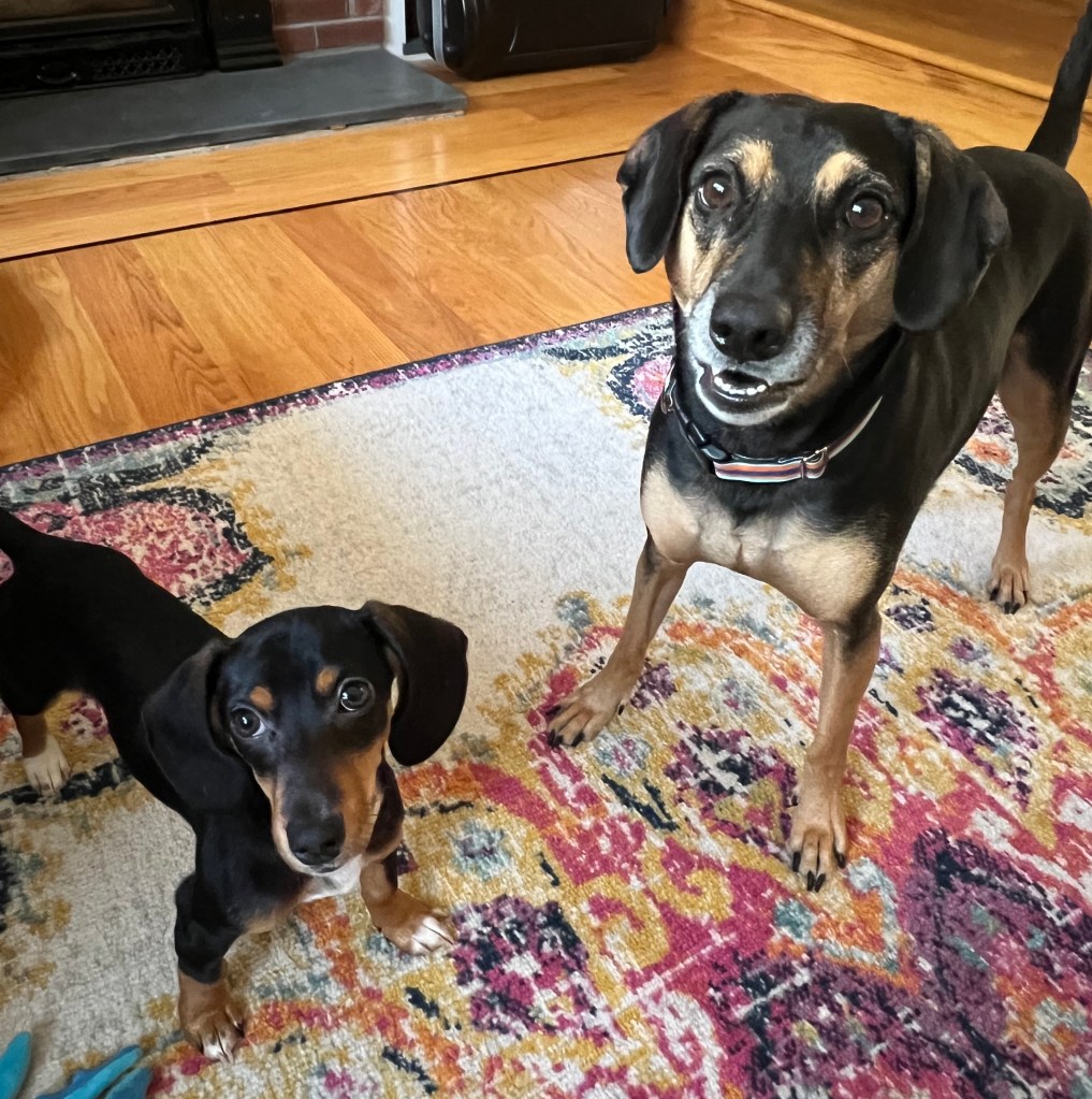 Lucy and Bruno at playtime. Bruno is literally smiling that he has a new playmate.